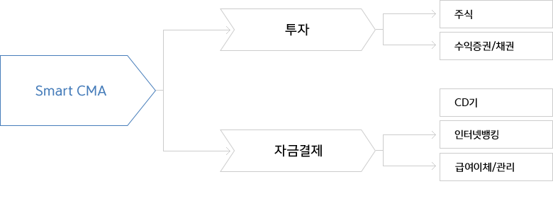 - CMA 증권카드는 Smart CMA 계좌를 통해 다양한 상품에 투자하고 계좌 입출금 기능 등을 제공합니다.